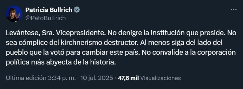 Con tono enérgico y directo, la funcionaria escribió: «Levántese, Sra. Vicepresidente. No denigre la institución que preside. No sea cómplice del kirchnerismo destructor», en alusión a la participación de la titular del Senado en una jornada legislativa que, a juicio de Bullrich, favorece al sector opositor y socava los principios que sostiene el oficialismo.