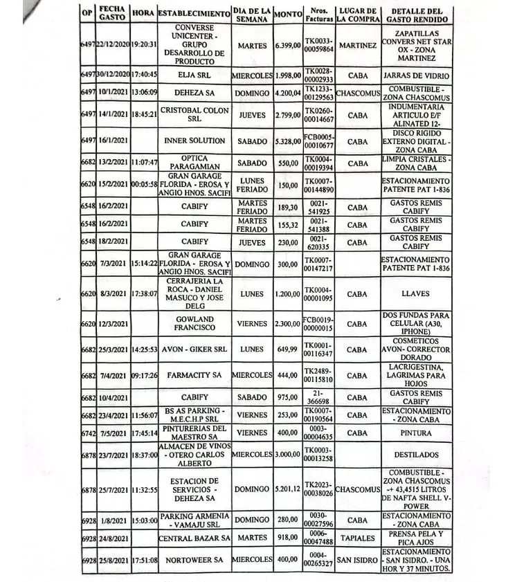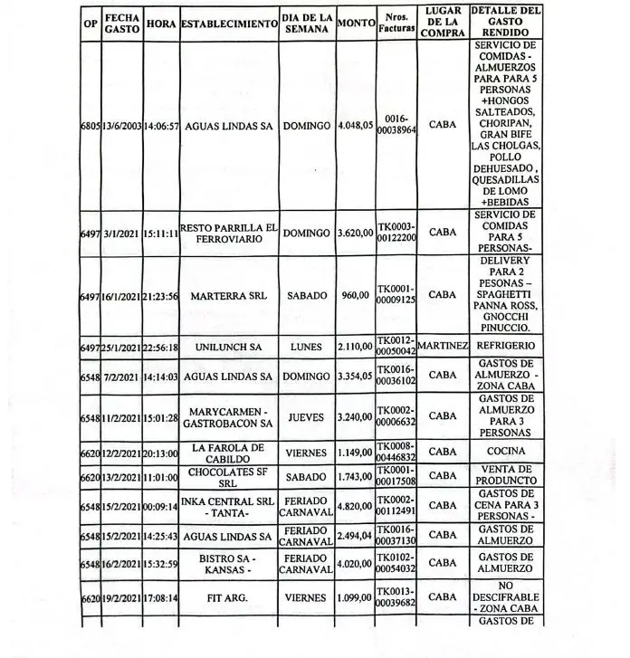 Entre los gastos destacados se encuentran compras en locales de venta rápida de fiambres, carne, pastas frescas, pescado, chocolates y helados; adquisición de cápsulas de café Nespresso con dirección de entrega a su domicilio; y gastos realizados en días y horarios no laborales o en la Costa Atlántica, así como en días y horarios laborales.