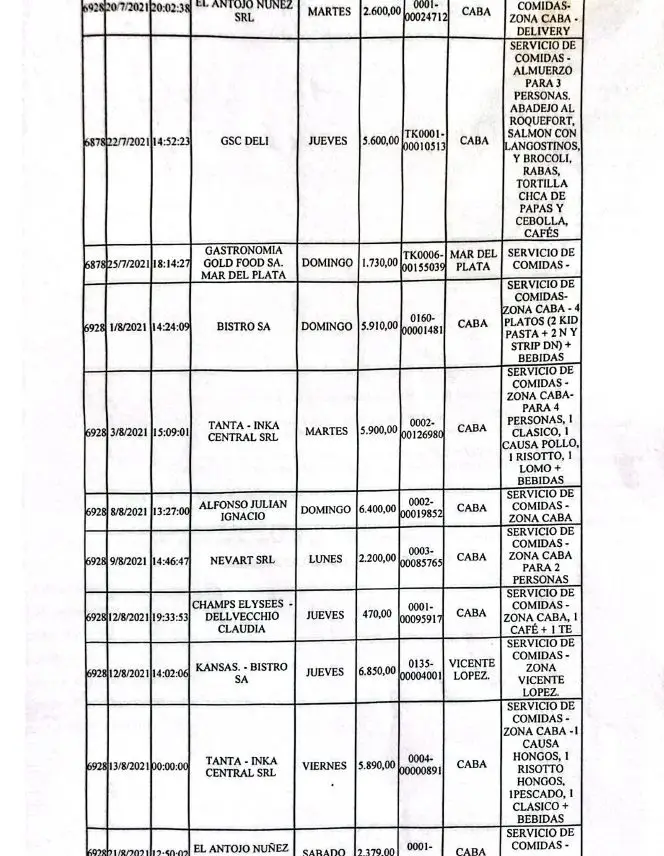 Entre los gastos destacados se encuentran compras en locales de venta rápida de fiambres, carne, pastas frescas, pescado, chocolates y helados; adquisición de cápsulas de café Nespresso con dirección de entrega a su domicilio; y gastos realizados en días y horarios no laborales o en la Costa Atlántica, así como en días y horarios laborales.