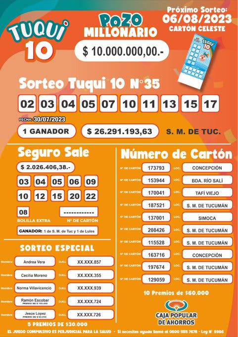El próximo sorteo será el domingo 6 de agosto por 10 millones de pesos con el boleto celeste. El Tuqui 10, organizado por la Caja Popular de Ahorros de Tucumán, tiene un pozo acumulable y se puede comprar en agencias y subagencias oficiales hasta el sábado o a través de vendedores ambulantes incluso el mismo domingo.
