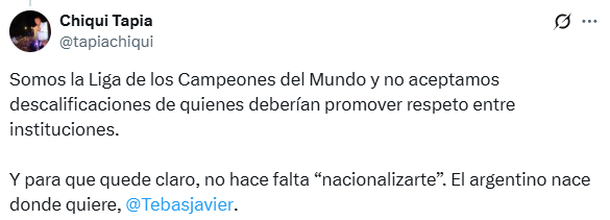 Tapia también recordó que Tebas ya había cuestionado instancias internacionales, como el Mundial de Clubes, señalando que sus críticas no son nuevas: “¿Qué podemos esperar, ahora, si ya nos criticaste incluso el Mundial de Clubes?”. Además, subrayó con firmeza el valor del fútbol argentino: “Somos la Liga de los Campeones del Mundo y no aceptamos descalificaciones de quienes deberían promover respeto entre instituciones. Y para que quede claro, no hace falta ‘nacionalizarte’. El argentino nace donde quiere, @Tebasjavier”.