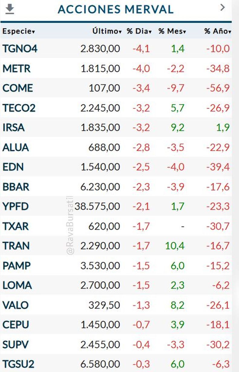 En contraste, otras ADRs cerraron en rojo. Edenor lideró las bajas con un descenso del 2%, seguida por Loma Negra (-1,6%), Irsa (-1,5%), BBVA (-1,3%) y Transportadora de Gas del Sur, que perdió un 0,9%.
