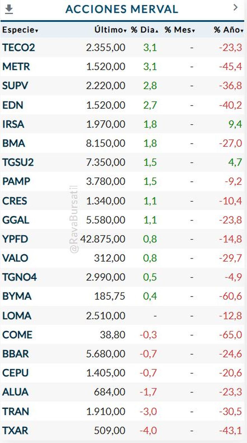 Dentro del panel de acciones líderes, los mayores incrementos se observaron en Metrogas y Telecom, ambas con un alza del 3,1%, seguidas por Grupo Supervielle (+2,8%), Edenor (+2,7%), Irsa (+1,8%) y Banco Macro (+1,8%).