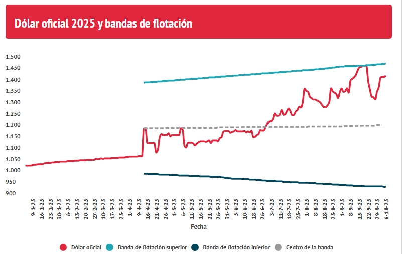 Mientras tanto, las reservas internacionales brutas del Banco Central cayeron USD 70 millones, situándose en USD 42.628 millones, a pesar del incremento del 2% en el precio del oro, que se aproximó a los USD 4.000 por onza. El techo de la banda cambiaria fijado por el BCRA para la jornada fue de $1.483,67, un 3,8% por encima del tipo de cambio mayorista. Una vez superado ese nivel, la autoridad monetaria tiene la facultad de intervenir con ventas de divisas sin necesidad de absorber los pesos emitidos para esa operación.