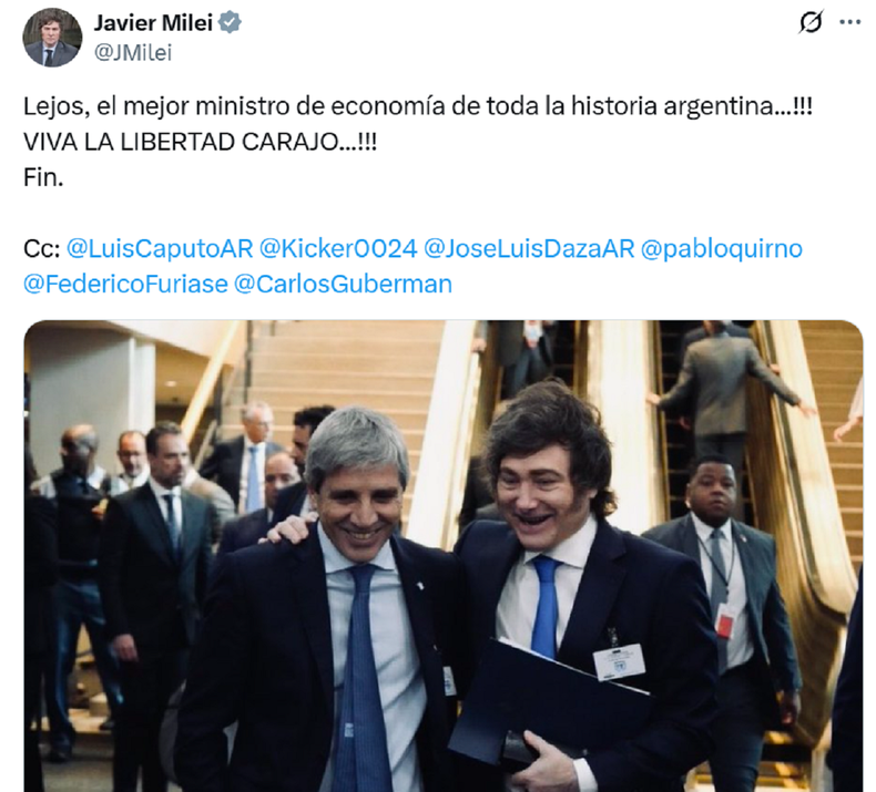El presidente argentino, Javier Milei, expresó su reconocimiento al ministro de Economía, Luis Caputo, luego de que Scott Bessent, secretario del Tesoro de Estados Unidos, anunciara este jueves la concreción de un acuerdo de swap por 20 mil millones de dólares con Argentina, acompañado de la primera intervención mediante la compra de pesos en el mercado local. A través de su cuenta en X, Milei destacó nuevamente el trabajo de Caputo, quien actualmente se encuentra en Washington participando de las negociaciones. “¡Lejos, el mejor ministro de economía de toda la historia argentina! ¡Viva la libertad carajo! Fin”, escribió el mandatario, mostrando su entusiasmo por el avance en la coordinación financiera internacional.