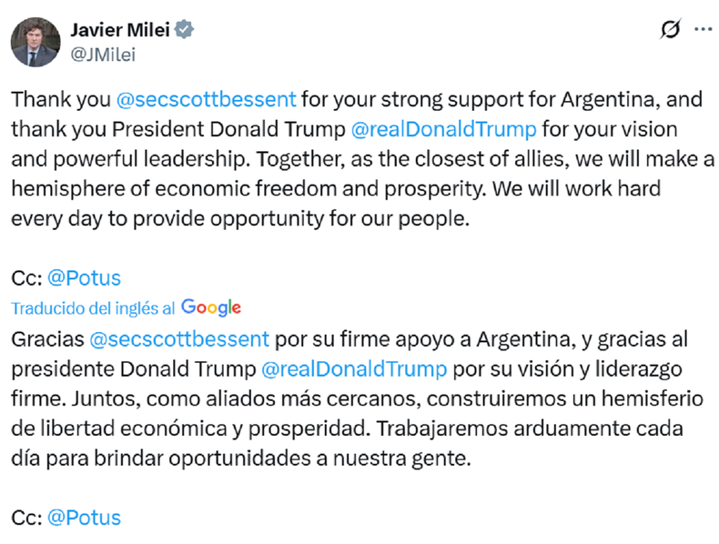 En este marco, Milei también agradeció directamente a Bessent y a Trump, destacando su respaldo y visión: “Gracias Scott Bessent por su firme apoyo a Argentina, y gracias al presidente Donald Trump por su visión y liderazgo firme. Juntos, como aliados más cercanos, construiremos un hemisferio de libertad económica y prosperidad”. El jefe de Estado concluyó reafirmando su compromiso: “Trabajaremos arduamente cada día para brindar oportunidades a nuestra gente”, subrayando el enfoque de su gestión en consolidar la estabilidad financiera y generar crecimiento económico sostenible para el país.