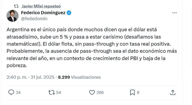 El mensaje original pertenece a Federico Domínguez, autor de títulos como La Rebelión de los Pandemials, Argentina Hiperacelerada y Volver a Ser Grandes. En su publicación, Domínguez reflexiona sobre la singularidad del escenario argentino actual: “Argentina es el único país donde muchos sostienen que el dólar está extremadamente rezagado, sube apenas un 5 % y ya lo consideran carísimo. ¡Desafiamos la lógica matemática!”. Y añade que el dólar se mueve libremente, sin generar un efecto de traspaso significativo a los precios y en un contexto donde las tasas de interés reales se mantienen en terreno positivo.