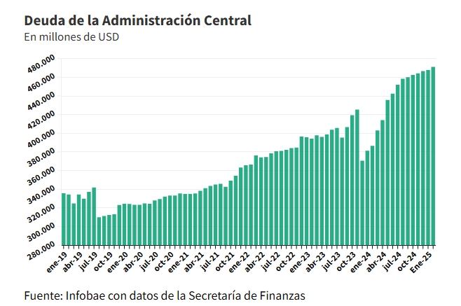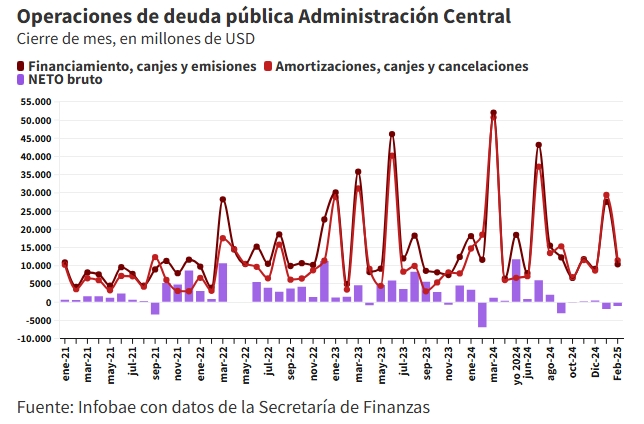 Desde diciembre de 2023 hasta febrero de 2025, la deuda bruta de la Administración Central registró un incremento total de 45.856 millones de dólares.