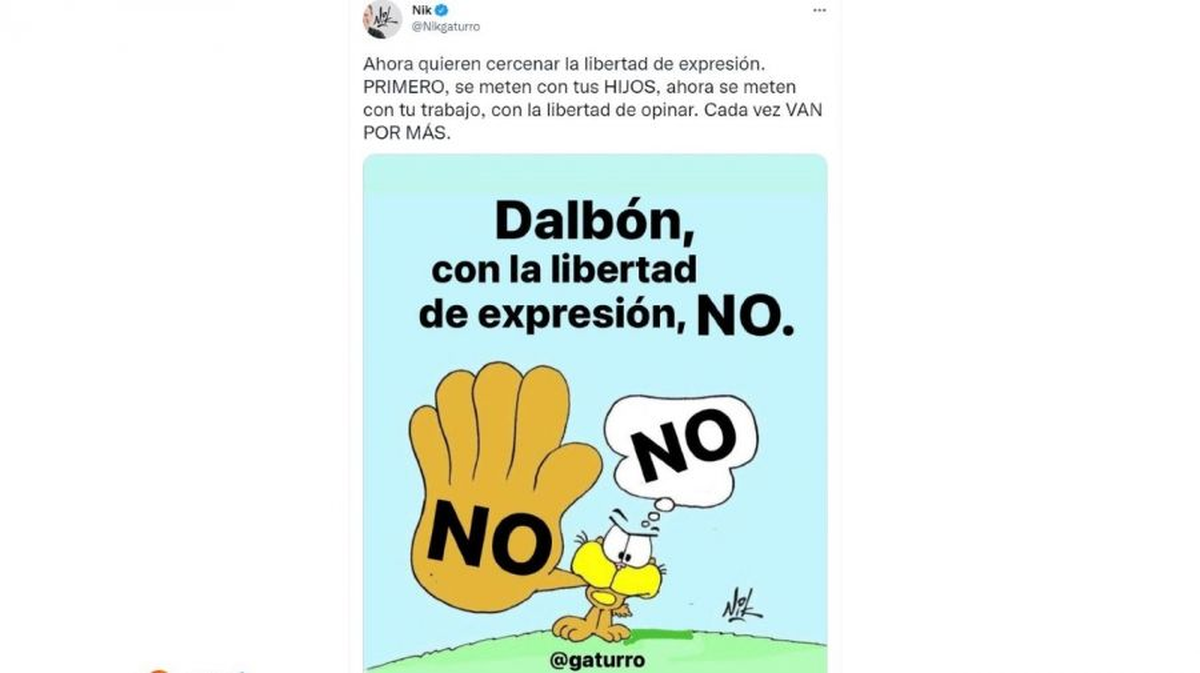 «Ahora quieren cercenar la libertad de expresión. PRIMERO, se meten con tus HIJOS, ahora se meten con tu trabajo, con la libertad de opinar. Cada vez VAN POR MÁS», escribió Nik junto a una caricatura recordando el filoso intercambio que tuvo tiempo atrás con el ministro de Seguridad, Aníbal Fernández.