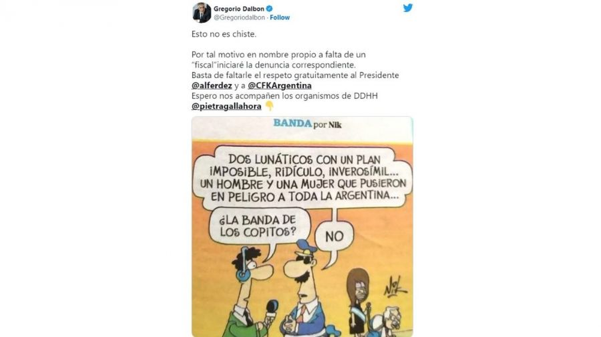 Inmediatamente, el abogado Gregorio Dalbón, advirtió que lo llevará ante la Justicia: «No es un chiste. Por tal motivo en nombre propio a falta de un “fiscal” iniciaré la denuncia correspondiente. Basta de faltarle el respeto gratuitamente al Presidente Alberto Fernández y la vicepresidenta Cristina Fernández. Espero que nos acompañen los organismos de derechos humanos», agregó.