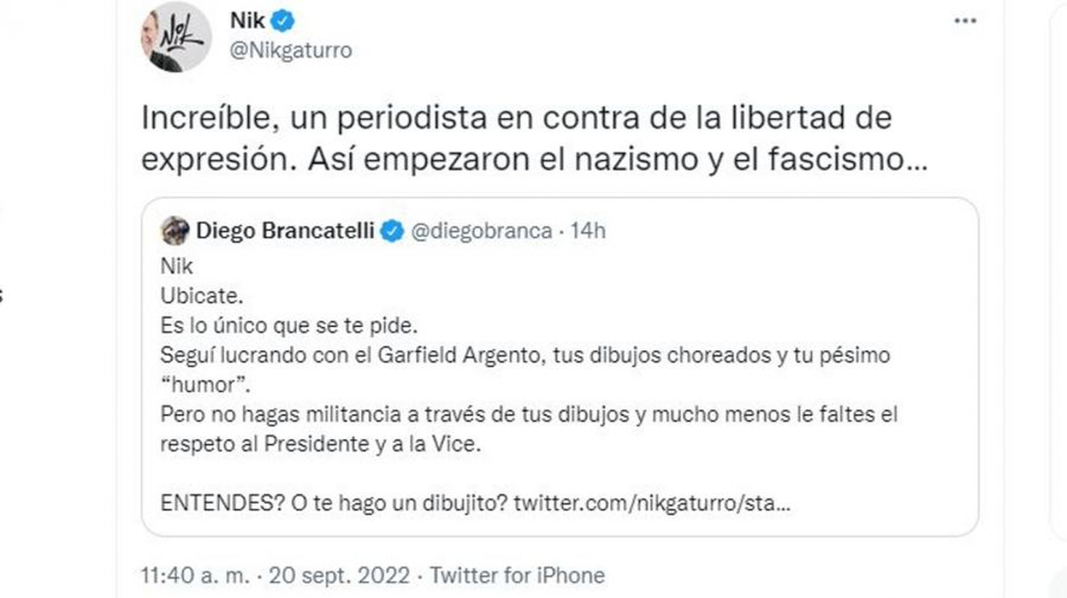 La polémica con Nik comenzó cuando el caricaturista publicó una polémica viñeta en donde bromeó sobre el intento de asesinato contra la vicepresidenta Cristina Fernández de Kirchner. Gregorio Dalbón, letrado de la exmandataria, lo cruzó en la red y afirmó que lo llevaría ante la Justicia. Después de que Nik se refirió al tema en Twitter, Diego Brancatelli salió en defensa de Cristina Kirchner y Alberto Fernández y le exigió que tuviera respeto por sus investiduras.
