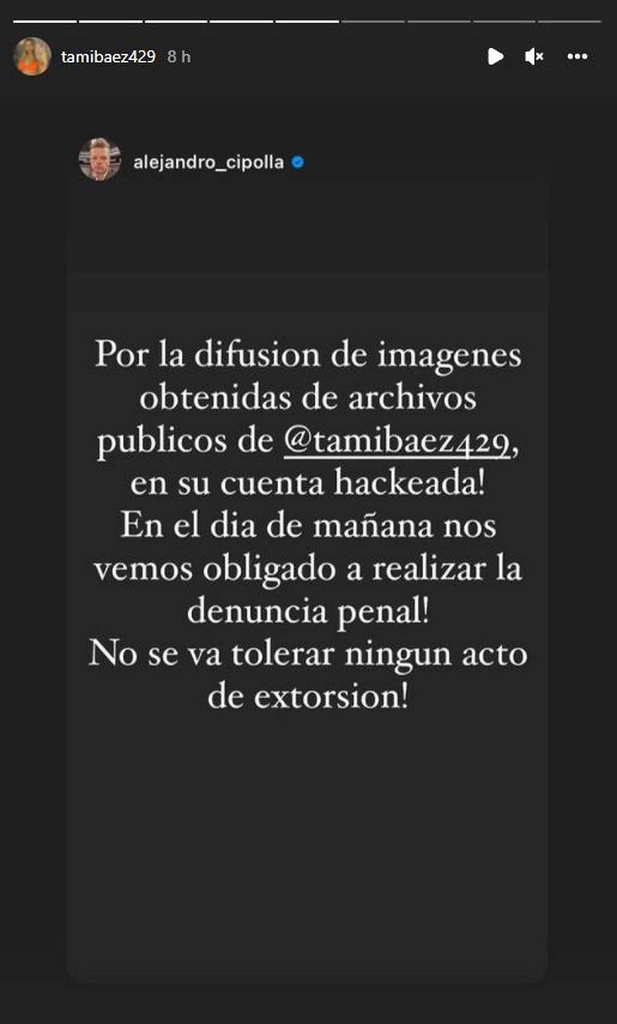 “Por la difusión de imágenes obtenidas de archivos públicos de Tamara Báez en su cuenta hackeada, en el día de mañana nos vemos obligados a realizar la denuncia penal. No se va a tolerar ningún acto de extorsión”, escribió Cipolla.