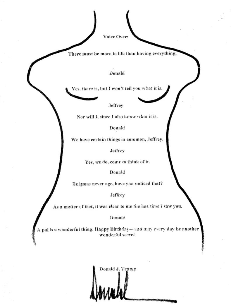 «Voz en off: / Debe haber más en la vida que tenerlo todo. / Donald: Sí, lo hay, pero no te diré qué es. / Jeffrey: Yo tampoco, pues yo también sé que es. / Donald: Tenemos ciertas cosas en común, Jeffrey. / Jeffrey: Es cierto, ahora que lo pienso. / Donald: Los enigmas nunca envejecen, ¿te has fijado? / Jeffrey: De hecho, me quedó claro la última vez que te vi. / Donald: Un amigo es algo maravilloso. Feliz cumpleaños, y que cada día sea otro secreto maravilloso. Donald J. Trump».