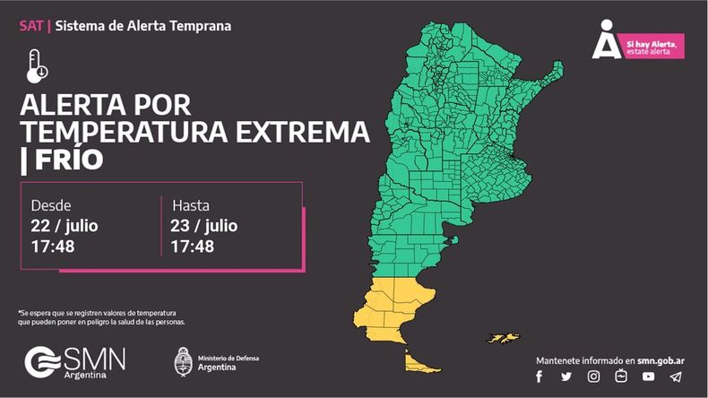 El alerta rige para toda la provincia de Santa Cruz y la de Tierra del Fuego, Antártida e Islas del Atlántico Sur, incluidas las Islas Malvinas. Esta mañana las tres localidades más frías del país estaban ubicadas precisamente en la Patagonia Austral.