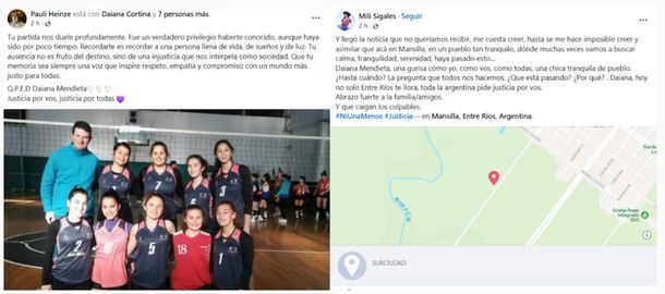 Otra amiga, Camila, se sumó al reclamo: “Por favor, muevan el pueblo, por Daia y por cada una de nuestras hermanas, sobrinas, hijas. ¡Prendan fuego todo, NOS ESTÁN MATANDO! ¡Que paguen los que tienen que pagar! JUSTICIA POR DAIA”. De forma similar, Milagros expresó su desconcierto y tristeza: “Y llegó la noticia que no queríamos recibir. Me cuesta creer, hasta se me hace imposible creer y asimilar que acá en Mansilla, en un pueblo tan tranquilo, donde muchas veces vamos a buscar calma, tranquilidad, serenidad, haya pasado esto. Daiana Mendieta, una gurisa como yo, como vos, como todas, una chica tranquila de pueblo. ¿Hasta cuándo? La pregunta que todos nos hacemos: ¿qué está pasando? ¿por qué? Daiana, hoy no solo Entre Ríos te llora, toda la Argentina pide justicia por vos. Y que caigan los culpables”.