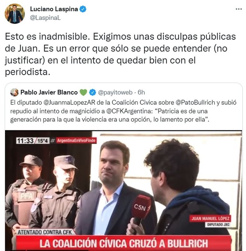«Esto es inadmisible. Exigimos unas disculpas públicas de Juan. Es un error que sólo se puede entender (no justificar) en el intento de quedar bien con el periodista», publicó Laspina.
