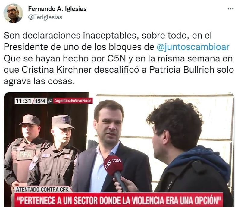 En la misma línea tuiteó Iglesias: «Son declaraciones inaceptables, sobre todo, en el Presidente de uno de los bloques de Juntos por el Cambio. Que se hayan hecho por C5N y en la misma semana en que Cristina Kirchner descalificó a Patricia Bullrich solo agrava las cosas».