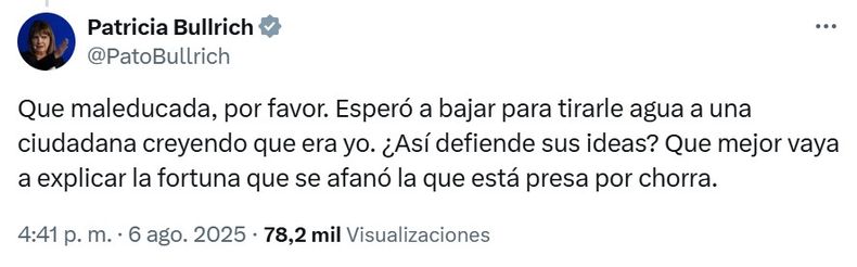 Luego de que el video se hiciera viral y ganara repercusión, Patricia Bullrich, la ministra involucrada indirectamente en el episodio, decidió manifestarse a través de sus redes sociales. Utilizando su cuenta de X (anteriormente conocida como Twitter), Bullrich calificó a la agresora como “maleducada” y cuestionó el comportamiento de quien cometió la agresión. En respuesta a una publicación que compartió el video, la ministra escribió: “Qué maleducada, por favor”, y añadió una crítica hacia la mujer que lanzó el agua: “Esperó a bajar para tirarle agua a una ciudadana creyendo que era yo. ¿Así defiende sus ideas?”.