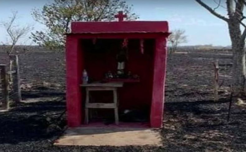 Un vecino del lugar grabó un video donde mostró el desastre que generó el fuego en un gran descampado ubicado en la entrada del pueblo. En las imágenes se ve cómo las llamas arrasaron con todo pero no pudo con un santuario del santo popular instalado al pie de un árbol.