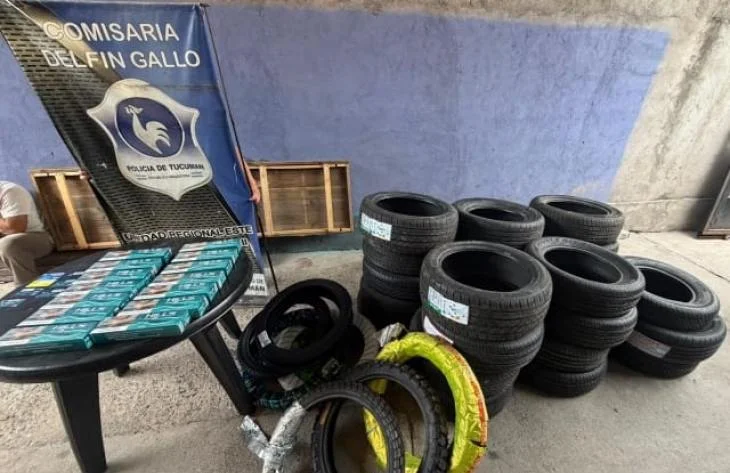 En simultáneo, otro equipo policial registró una vivienda en la zona de Villa Urquiza de San Miguel de Tucumán, donde hallaron 26 cubiertas de autos, 10 cubiertas de motocicletas, 14 atados de cigarrillos de origen extranjero y siete tarjetas bancarias pertenecientes a terceros. Todo el material quedó bajo cadena de custodia según lo ordenado por la Fiscalía de Robos y Hurtos, a cargo de la causa, para averiguación de procedencia.