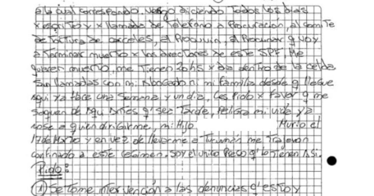 Figueroa, conocido en el mundo delictivo de Villa 9 de Julio, escribió este texto en el que también comunica que ha iniciado una huelga de hambre. En su carta, enfatiza que no se le permite recibir la visita de sus familiares ni mantener contacto con su abogado defensor, lo que lo hace sentir completamente desamparado. Además, menciona que ha presentado reiteradas denuncias contra el jefe de la guardia interna del módulo donde está alojado, acusándolo de hostigarlo de manera persistente y de incentivarlo a quitarse la vida. Como parte de su reclamo, solicita que se le traslade nuevamente a la cárcel de Villa Urquiza, en Tucumán, y que se le saque de la órbita del Servicio Penitenciario Federal.