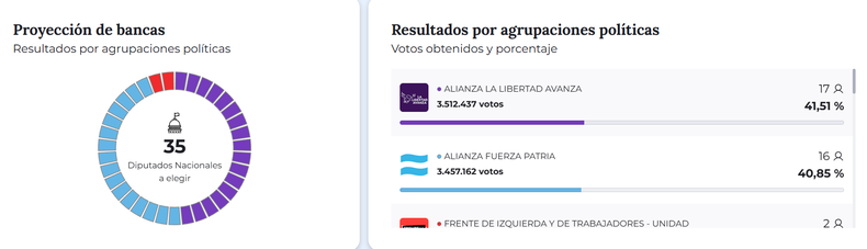 En términos de representación parlamentaria, la elección garantiza a La Libertad Avanza 17 bancas de diputados nacionales por la provincia de Buenos Aires, mientras que Fuerza Patria asegura 16 escaños y el Frente de Izquierda obtiene 2, lo que refleja la creciente fragmentación y competitividad del electorado bonaerense. Esta nueva distribución legislativa tendrá implicancias directas en la conformación del Congreso, reforzando la presencia del oficialismo libertario y abriendo la puerta a posibles cambios en la agenda política y las negociaciones parlamentarias a nivel nacional.