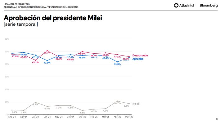 En el mes de mayo de 2025, la reconocida consultora brasileña Atlas Intel, en colaboración con Bloomberg, difundió su informe mensual sobre el panorama político y económico en Argentina. A pesar del fuerte descontento social frente a la situación económica del país, los datos revelan una paradoja llamativa: el presidente Javier Milei no solo conserva una imagen favorable entre un importante sector de la población, sino que incluso registra una mejora respecto a la medición anterior.