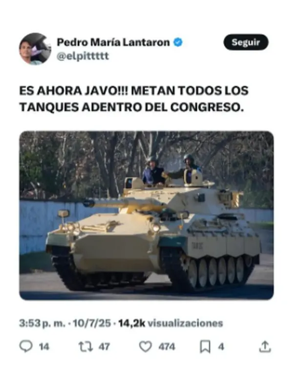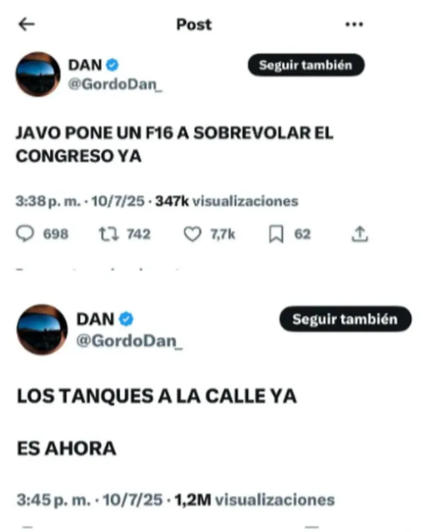 Entre los mensajes más alarmantes se encuentra uno publicado por Daniel Parisini (@ElGordoDan), quien escribió: «Hay que sacar los tanques a la calle, ya». Aunque luego intentó suavizar la expresión diciendo en tono irónico que se refería a “tanques de agua”, sus palabras ya habían sido ampliamente difundidas y rechazadas. Otros usuarios también se sumaron a esta retórica, con expresiones como “¡Los strikers por la 9 de Julio ahora, Javeto! El momento ha llegado”, o directamente solicitando la presencia de un avión de combate sobre el Congreso: “Javo, poné un F16 a sobrevolar el Congreso”.