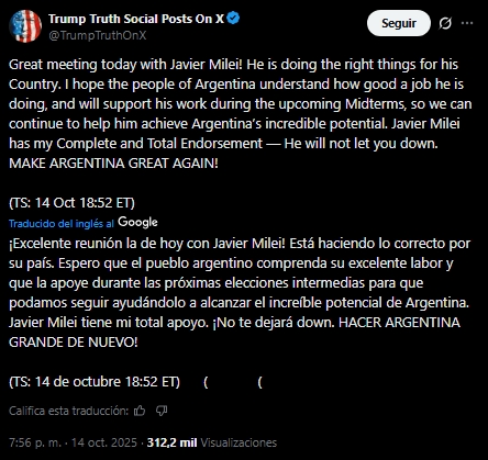El Gobierno intentó dejar en claro que Donald Trump, presidente de los Estados Unidos, no vinculó su apoyo financiero a Argentina con el resultado de las elecciones legislativas del 26 de octubre, sino que, según interpretaciones de Santiago Caputo, Manuel Adorni y Patricia Bullrich, sus declaraciones hacían referencia a los comicios presidenciales de 2027. Sin embargo, el operativo oficial para controlar los daños se vio frustrado por una nueva intervención del propio Trump, quien esta noche reafirmó sus palabras mediante un posteo en su red social Truth.