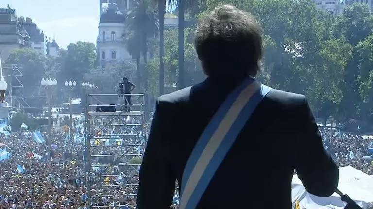 Desde el balcón presidencial de la Casa Rosada, el presidente Javier Milei se dirigió a la multitud congregada en la Plaza de Mayo para agradecer el apoyo y proclamar el fin de la denominada «noche populista» y el renacimiento de una Argentina próspera y liberal. Ante miles de personas, recibió una ovación al salir al balcón y entonar el tema de La Renga, gritando entusiastamente «Viva la Libertad, carajo».