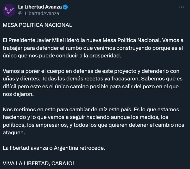 El comunicado del espacio libertario subrayó la intención de “poner el cuerpo en defensa de este proyecto y defenderlo con uñas y dientes”, asegurando que consideran su modelo como la única vía para salir de la situación en la que, según sostienen, el país ha sido dejado por gestiones anteriores. Además, remarcó que la iniciativa busca un cambio profundo en Argentina y que continuarán adelante pese a la oposición de medios, políticos y empresarios. “La libertad avanza o Argentina retrocede”, enfatizaron.