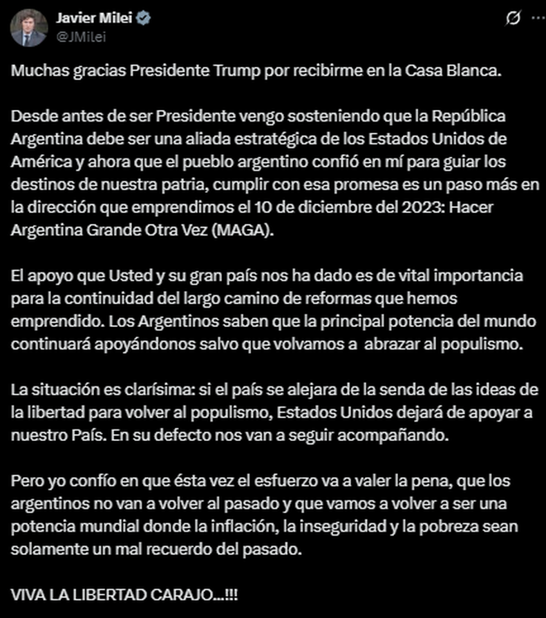 En su publicación, Milei agradeció personalmente a Trump: “Muchas gracias Presidente Trump por recibirme en la Casa Blanca. Desde antes de ser Presidente vengo sosteniendo que la República Argentina debe ser una aliada estratégica de los Estados Unidos de América”. Asimismo, el mandatario argentino vinculó esta visita con la continuidad de su proyecto: “Cumplir con esa promesa es un paso más en la dirección que emprendimos el 10 de diciembre de 2023: Hacer Argentina Grande Otra Vez (MAGA)”.