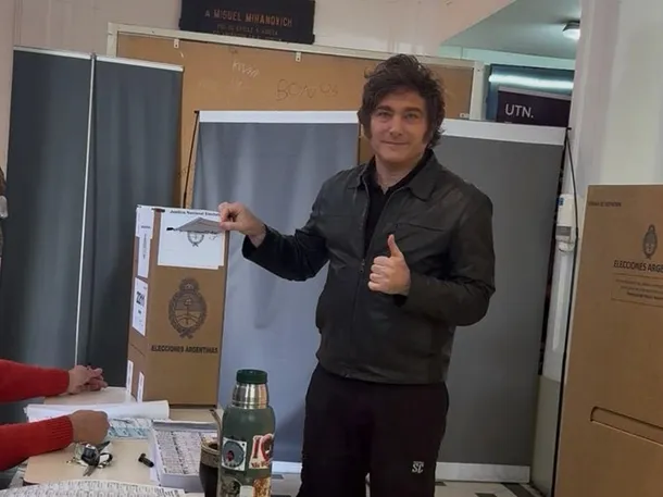 Tras hacer la fila correspondiente, Milei llegó al momento de su turno, saludó cordialmente a los fiscales de mesa y al presidente de la mesa 2211 en Almagro, y recibió su boleta para votar. Una vez cumplido este paso, abandonó la cabina sin ofrecer comentarios a la prensa y, antes de subir a su vehículo para retirarse, saludó nuevamente al público, recibiendo algunas quejas y manifestaciones de apoyo. Posteriormente, regresó a la residencia oficial de Olivos, donde permaneció durante el resto de la jornada, hasta que por la tarde se dirigió al búnker político montado en el Hotel Libertador sobre Avenida Córdoba, desde donde seguiría los resultados junto a su equipo.