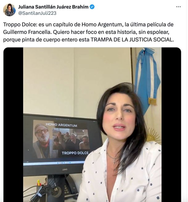 En esta oportunidad, Santillán decidió sumarse al entusiasmo que genera Homo Argentum entre los seguidores de Javier Milei, uno de los máximos exponentes del movimiento libertario. El propio presidente ha hablado de la película en conferencias internacionales, afirmando incluso haberla visto dos veces, acompañando sus visualizaciones con funcionarios nacionales e incluso en reuniones oficiales.