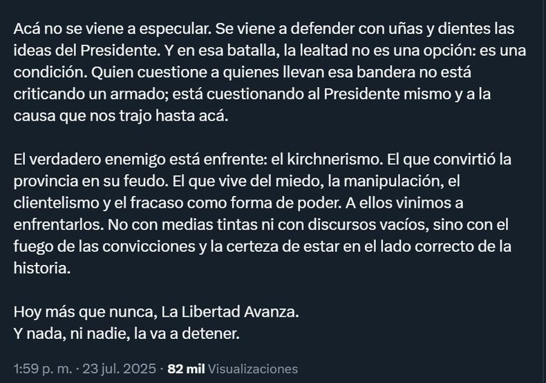 En ese marco, la intervención de Karina Milei funcionó como un mensaje de disciplina interna y una advertencia hacia quienes pudieran estar alimentando fracturas dentro del oficialismo. Su publicación dejó claro que, desde la visión del entorno presidencial, la lealtad absoluta al proyecto y al liderazgo de Javier Milei es una exigencia indeclinable, y que cualquier voz disonante será interpretada como una deslealtad hacia la esencia misma del espacio gobernante.