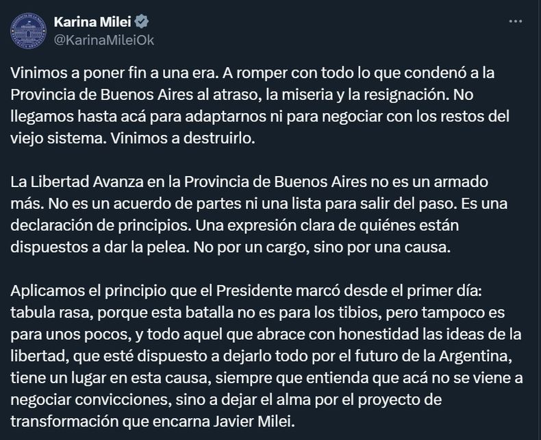 A través de una publicación en su cuenta de la red social X (antes Twitter), Karina Milei reafirmó el rumbo político delineado por el Ejecutivo y dejó en claro que no hay lugar para disidencias que puedan interpretarse como ataques al liderazgo de su hermano, el presidente Javier Milei. En un mensaje contundente, expresó: “Acá no se viene a especular. Se viene a defender con uñas y dientes las ideas del Presidente. Y en esa batalla, la lealtad no es una opción: es una condición”. Con estas palabras, subrayó que cualquier señalamiento hacia los candidatos seleccionados no representa una simple diferencia de criterio, sino una crítica directa al propio jefe de Estado y a los principios que sustentan su gobierno.