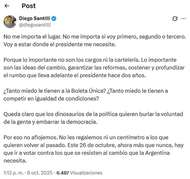 A través de su cuenta oficial en X, Santilli compartió un extenso descargo, dejando en claro que no le preocupa si figura en primer, segundo o tercer lugar en la lista: «Voy a estar donde el Presidente me necesite», escribió, destacando que para él lo relevante no son los cargos ni la visibilidad en la cartelería electoral, sino las ideas y las reformas que se buscan implementar. Según el dirigente, lo esencial es sostener y profundizar el rumbo del presidente, que lleva adelante su gestión desde hace dos años. Santilli, quien se desempeña actualmente como diputado nacional por la provincia de Buenos Aires y fue vicejefe de Gobierno porteño bajo la conducción de Horacio Rodríguez Larreta, enfatizó que su compromiso está con las propuestas y los objetivos políticos, más que con los lugares de privilegio en la lista.