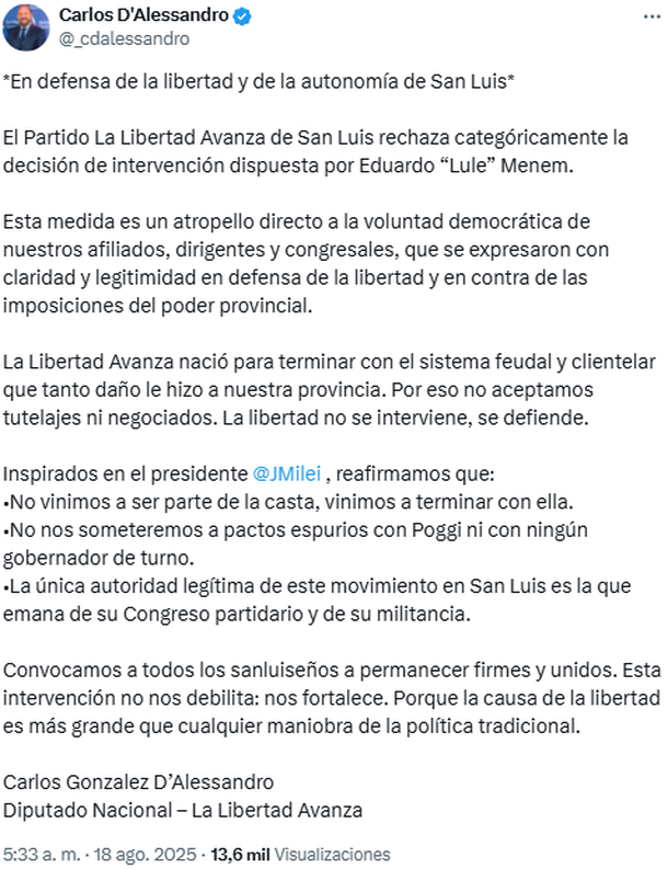 La relación de D’Alessandro con la conducción nacional de La Libertad Avanza se viene deteriorando desde hace tiempo. Recientemente denunció al dirigente Eduardo “Lule” Menem, a quien responsabilizó de haber “intervenido” la vida política de San Luis al imponer candidaturas para las elecciones legislativas sin permitir la participación real de la militancia local. “Nos intervinieron el partido, nos quitaron la libertad de acción para elegir a nuestros propios candidatos y nos impusieron la casta por la ventana”, acusó, remarcando que esa situación significó un quiebre político con el Gobierno: “Vinimos a cambiar la historia de Argentina, no a ser cómplices de viejas prácticas”.
